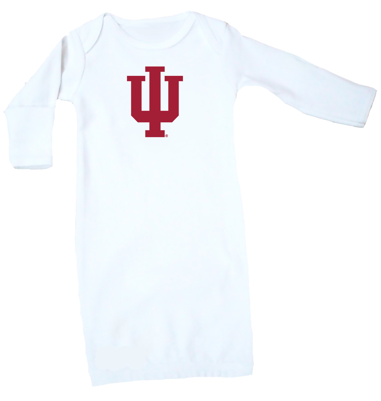 Wrap your new Indiana Hoosiers fan in our premium layette gown. This ultra soft adorable 100% cotton interlock Layette Gown has lapped shoulders for comfort and a great fit. The long sleeves have generous mitten cuffs at the end to keep baby warm and safe from scratchy nails!